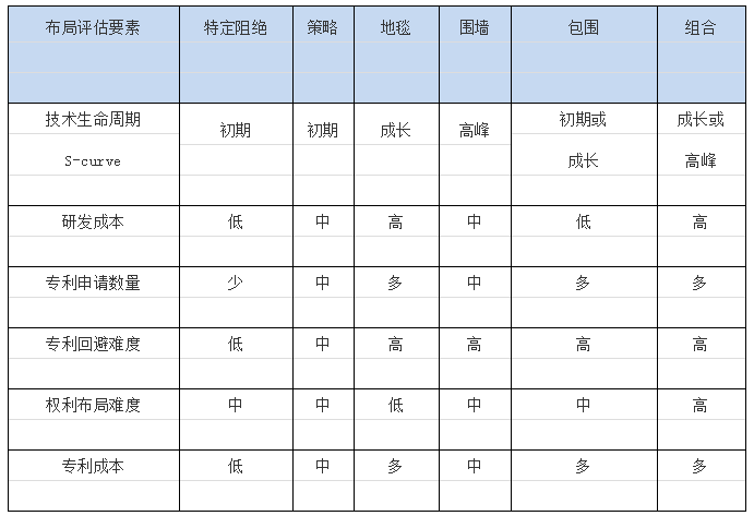 在這些方式中,提供評(píng)估技術(shù)生命周期曲線、研發(fā)成本、專利申請(qǐng)數(shù)量、專利成本、專利回避難度、權(quán)利布局難度共六個(gè)初步評(píng)估指標(biāo)作為企業(yè)選擇適合布局使用方案的參考。