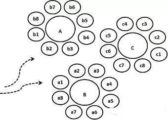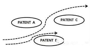 如圖 2 所示特定的阻絕,Patent A/B/C 分別取得特定技術(shù)方案的權(quán)利范圍,申請(qǐng)數(shù)量少,維護(hù)成本低,這種方式權(quán)利范圍間存在空隙,競爭對(duì)手容易回避,而競爭對(duì)手回避所耗費(fèi)的資源也可能不高。此種類型的專利布局重點(diǎn)不在于防止對(duì)手回避,而是如何取得相對(duì)優(yōu)勢(shì)的技術(shù)方案的權(quán)利范圍。