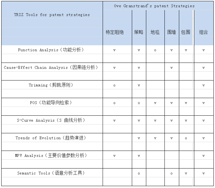 本文通過列出已知專利布局方案(Ove Granstrand &Sergei Ikovenko),通過與現(xiàn)代 TRIZ工具的比對(duì),列出現(xiàn)代 TRIZ 工具可應(yīng)用于專利布局(Ove Granstrand’s patent strategies)的工具作為布局時(shí)的思路參考。